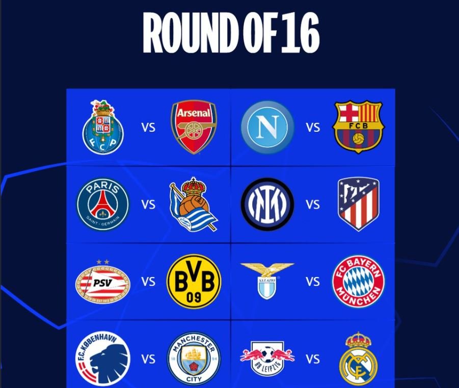 Oι αναμετρήσεις που προέκυψαν για την «φάση των 16» του Champions League, μετά την σημερινή (18/12) κλήρωση στη Νιόν, επεφύλαξε δύο ντέρμπι μεταξύ της Ίντερ με την Ατλέτικο Μαδρίτης και της Νάπολι με τη Μπαρτσελόνα.