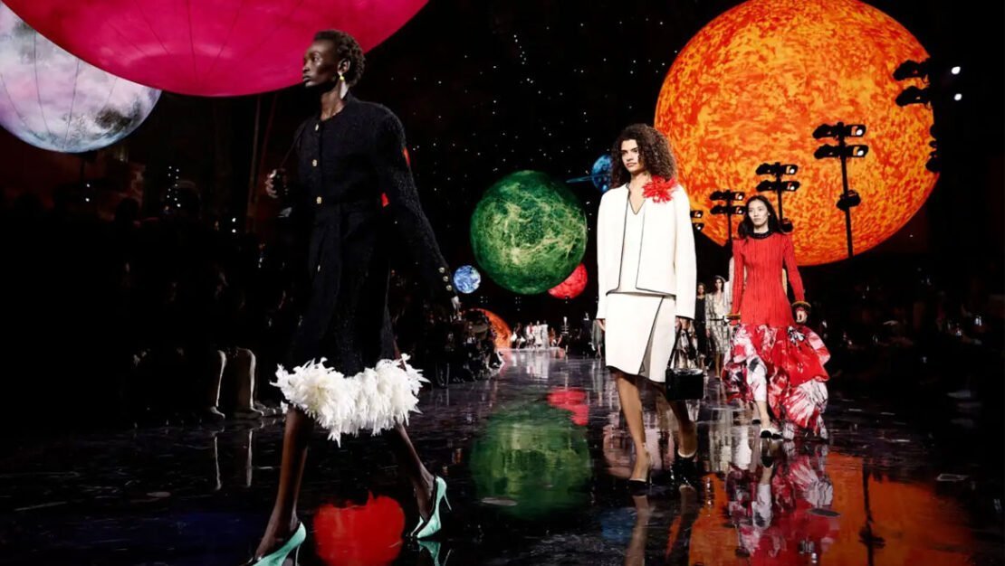 Το σκηνικό θύμιζε κάτι από διαστημική φαντασία — τεράστιες, καθρεφτιστικές σφαίρες σε ένα δάπεδο που έλαμπε, δημιουργούσαν ένα σκηνικό που θύμιζε τις εντυπωσιακές παραγωγές της εποχής Lagerfeld.