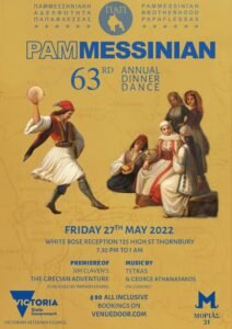 Την ετήσια χοροεσπερίδα της διοργανώνει η Παμμεσσηνιακή Αδερφότητα “Ο Παπαφλέσσας” την Παρασκευή 27 Μαΐου 2022 στο White Rose reception, 725 High St, Thornbury.