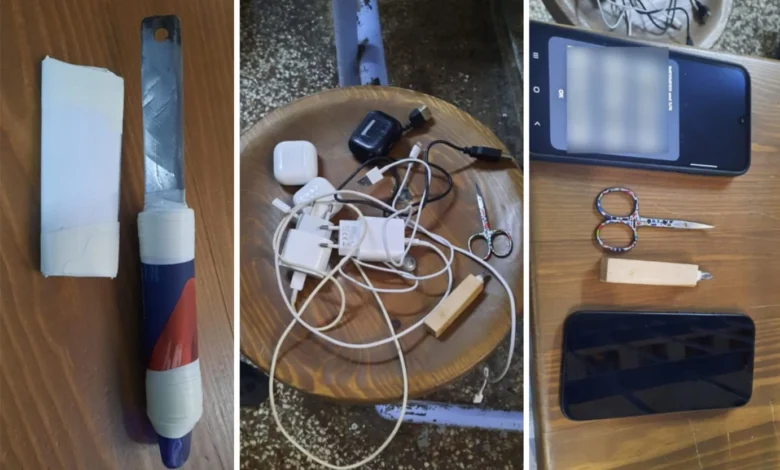 Σύμφωνα με νεότερη ενημέρωση από την ΕΛ.ΑΣ. έχουν εντοπιστεί και κατασχεθεί δύο κινητά τηλέφωνα, ένα ψαλιδάκι, ένα αυτοσχέδιο μαχαίρι και ένα αυτοσχέδιο σουβλί.