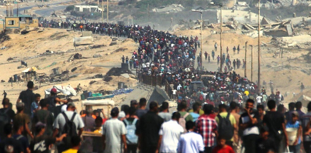 Ένα τεράστιο ρεύμα ανθρώπων εκτεινόταν κατά μήκος του οδικού άξονα αλ Ρασίντ, κοντά στη Νουσεϊράτ, στο κεντρικό τμήμα της Λωρίδας της Γάζας, με κατεύθυνση την πόλη της Γάζας.