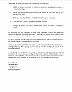Παρακάτω είναι το εξώδικο που έστειλε ο πρώην υπήλληλος της ομοσπονδίας στον επίτιμο πρόεδρο Γιάννη Κωστούλια που τον κατηγορεί για την μη τήρηση του νόμου.