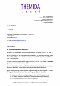 Πολλά ανοιχτά μέτωπα απ ότι βέπουμε έχει ανοίξει ο επίτιμος πρόεδρος της ομοσπονδίας ηλικιωμένων Γιάννης Κωστούλιας και το τελευταίο έρχεται με την μορφή του εξώδικου από γνωστό δικηγορικό γραφείο της παροικίας μας και αφορά τον πρώην υπάλληλο της ομοσπονδίας και εκλεκτό μέλος της παροικίας μας, Μιχάλη Προφύρη. Ο επίτιμος έχει έρθει σε αντιπαράθεση μέ όλους τους υπαλλήλους που έχουν εργαστεί στην ομοσπονδία και όλους τους έχει διώξει, άλλους με απειλές, άλλους καλώντας την αστυνομία και άλλους τους εκβίαζε ψυχολογικά στέλνωντας τους “ραβασάκια” και σε άλλους αφήνοντας “ευχετήριες” κάρτες στο γραμματοκιβώτιο τους. Η αρχή έγινε με το που πάτησε το πόδι του στην ομοσπονδία και έδιωξε τον μέχρι τότε συντονιστή, Γιώργο Κατσουράκη που υποχρεώθηκε να τον αποζημιώσει μετά από δικαστική απόφαση, στην συνέχεια έδιωξε την επόμενη συντονίστρια Κυριακή Μενουδέα και είχε δικαστική αντιπαλότητα με αυτήν, μετά έδιωξε τον επόμενο συντονιστή Μιχάλη Προφύρη και ενώ το δικαστήριο έβγαλε καταδικαστική απόφαση εναντίον του επίτιμου προέδρου ακόμα μετα από δυο χρόνια αυτός αρνείται να εκτελέσει. Έφερε την αστυνομία να βγάλει έξω την επόμενη υπάλληλο Χριστίνα Δαλιάνη, έδιωξε την Στεφανία Παναγοπούλου με βίαιο τρόπο και την έχει κατηγορήσει για ψευδή κατάθεση (έχουμε στοιχεία ότι αυτο που αναφέρει ο επίτιμος πρόεδρος είναι ψέμα) και τέλος αρνείται να πληρώσει την παραγωγή της εκπομπής “Καλησπέρα Μελβούρνη” το ποσό που χρωστάει κατόπιν πολλών ενοχλήσεων. Σε αυτό το σημείο αξίζει να σημειωθεί ότι ο επίτιμος πρόεδρος της ομοσπονδίας ηλικιωμένων Γιάννης Κωστούλιας μάζευε υπογραφές για να σταματήσει τις δυο Ελληνικές εκπομπές από το κανάλι 31 γιατι δεν το “έδειχναν” όπως έλεγε στο Δ/Σ της ομοσπονδίας.