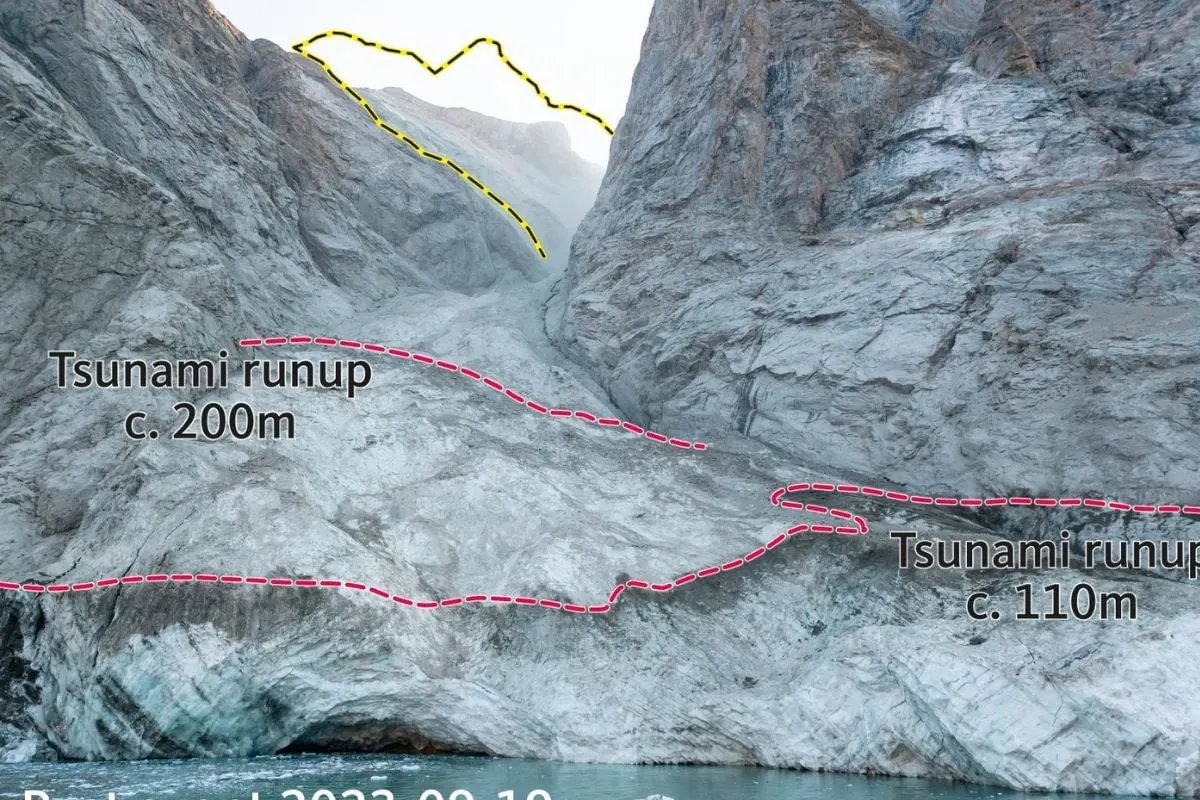 Η κατάρρευση της βουνοκορφής, ύψους 1.200 μέτρων, στο φιόρδ Dickson έγινε στις 16 Σεπτεμβρίου 2023, καθώς ο παγετώνας έλιωσε και δεν μπορούσε πλέον να συγκρατεί τα βράχια. Από την κατάρρευση προκλήθηκε ένα πρώτο κύμα ύψους 200 μέτρων, το οποίο έστελνε σεισμικά κύματα σε ολόκληρο τον πλανήτη για περισσότερο από μία εβδομάδα.