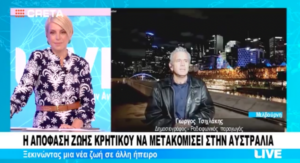 Ο γνωστός δημοσιογράφος και ραδιοφωνικός παραγωγός του “Ραδιο Κρήτη” Γιώργος Τσιχλάκης που εδώ και ένα χρόνο βρίσκεται την Μελβούρνη συνδέθηκε ζωντανά με το “Creta tv” για τις ανάγκες της τηλεοπτικής εκπομπής “Live με την Αντιγόνη” μέσα από την εκπομπή “ΚΑΛΗΣΠΕΡΑ ΜΕΛΒΟΥΡΝΗ” που μεταδίδεται στο κανάλι 31 κάθε Κυριακή στις 6:00 το βραδυ και την επιμέλεια έχει ο Σωτήρης Σωτηρόπουλος.