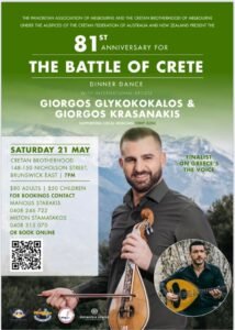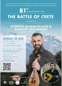 Η Παγκρήτιος Ένωσις, η Κρητική Αδερφότητα και η Ομοσπονδία Κρητικών Συλλόγων Αυστραλίας και Ν.Ζηλανδίας σας προσκαλεί να βρεθείτε στην εκδήλωση που θα γίνει για να τιμήσουμε την Μάχη της Κρήτης στην αίθουσα της Κρητικής Αδερφότητας στο Brunswick στις 21 Μαΐου.
