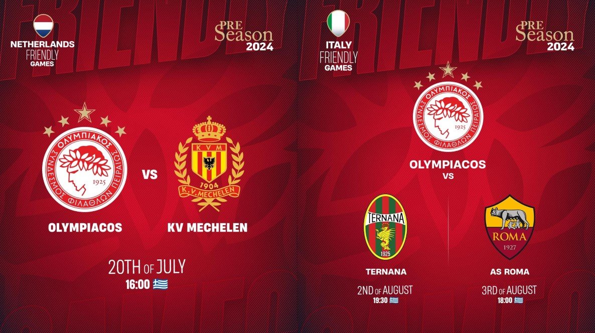 Τρία ακόμη φιλικά ανακοίνωσε ο Ολυμπιακός. Μαζί με τα ήδη προγραμματισμένα, με Άγιαξ, Αλ Κάντσιαχ, Ναϊμέγκεν, Νότιγχαμ Φόρεστ και Άρη Λεμεσού, θα παίξει τρία ακόμη, φτάνοντας τα οκτώ.