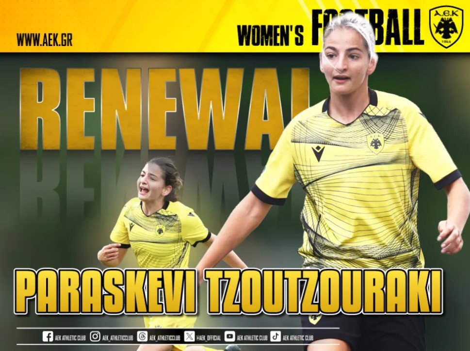 Η ΑΕΚ βρίσκεται στην πολύ ευχάριστη θέση να ανακοινώσει την ανανέωση της συνεργασίας της με την Παρασκευή (Βούλα) Τζουτζουράκη. Η 21χρονη αθλήτρια θα ενισχύσει και τη νέα σεζόν το τμήμα Ποδοσφαίρου Γυναικών του Συλλόγου.