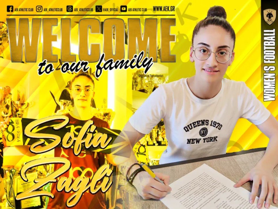 Η ΑΕΚ βρίσκεται στην ευχάριστη θέση να ανακοινώσει την έναρξη της συνεργασίας της με την Σοφία Ζαγκλή. Η 18χρονη (24/09/2006) διεθνής μέσος εντάσσεται στο δυναμικό της γυναικείας ομάδας Ποδοσφαίρου του Συλλόγου.