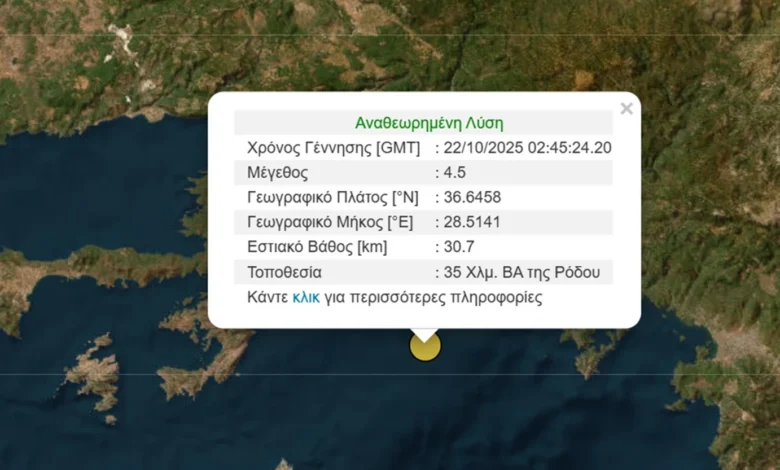 Σεισμός έντασης 4,5 Ρίχτερ καταγράφηκε το πρωί της Τετάρτης στα ανοικτά της Ρόδου.