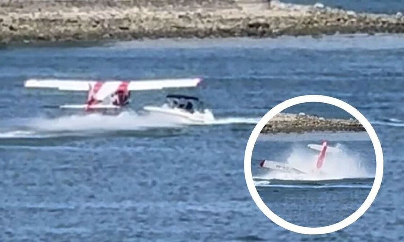 Σε βίντεο ντοκουμέντο φαίνεται η συγκλονιστική στιγμή που το υδροπλάνο περνάει πάνω ακριβώς από το σκάφος και το διαλύει και μετά πέφτει απότομα στη θάλασσα. Ο οδηγός του ταχύπλοου όντας σώος επιστρέφει στο υδροπλάνο για να δει αν είναι καλά οι επιβαίνοντες.